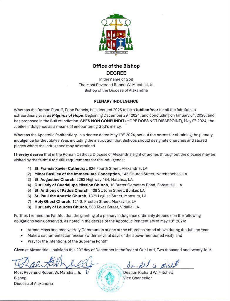 To receive the indulgence during the 2025 Jubilee Year, visit a pilgrimage site designated by Bishop Robert Marshall, attend Mass there or visit the Blessed Sacrament there.