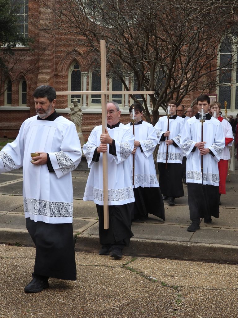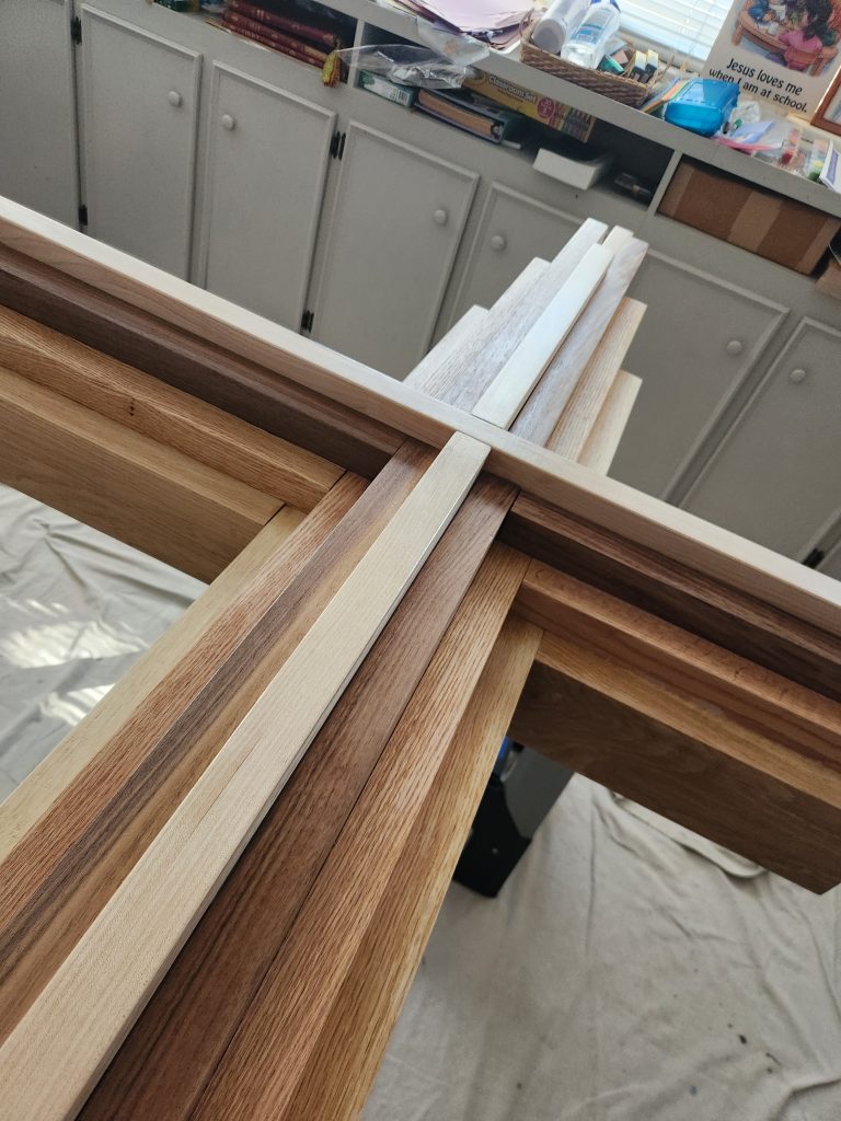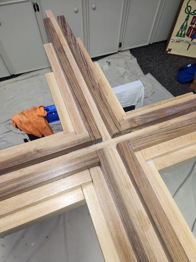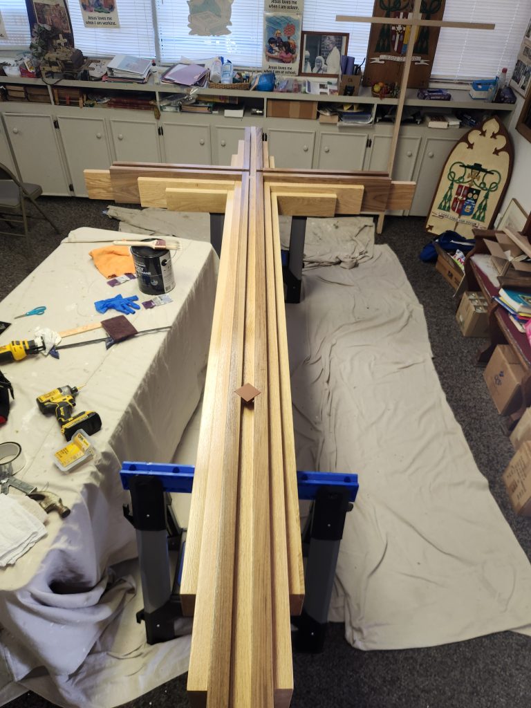 Cross is hand made of woods that are native to the Central Louisiana region and include: Black Walnut, Red Oak, Ash and Cypress.