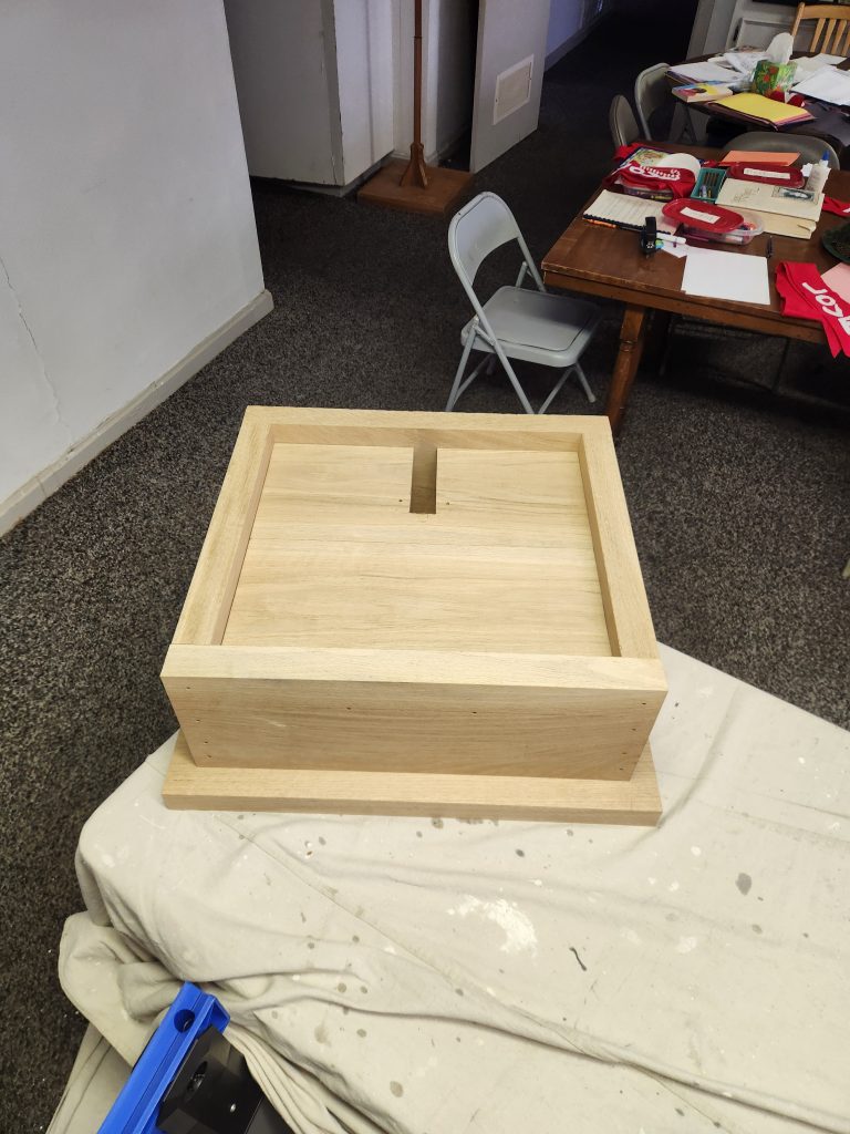 The base is made of white oak and pine.