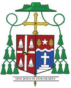 The coat of arms of the Diocese of Alexandria was adopted in 1933 by Bishop Daniel Desmond. They were designed by heraldist Pierre de Chaignon la Rose. They consist of a red field on which are placed a silver (white) cross between four silver (white) bells. The red background is used to signify the Red River that runs through the See City. The cross, which represents the Christian Faith, divides the four bells that are taken from the arms of the Patriarchal See of Alexandria, in Egypt, for which the See City is named. Overall, at the center of the design is a black and gold (yellow) checky (checkered) crescent, which is taken from the arms of the Spanish family “Xavier,” and this symbol is used throughout ecclesiastical heraldry as the classic charge for Saint Francis Xavier, titular of the cathedral-church in Alexandria.