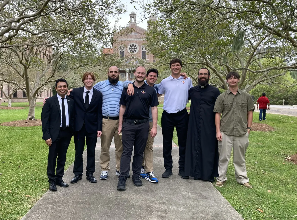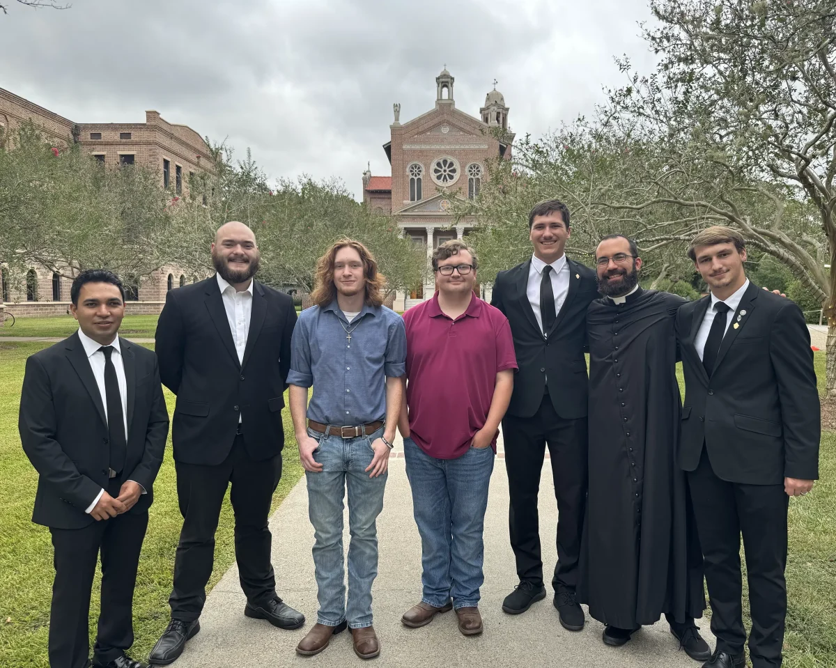 BISHOP MARSHALL VISITS SEMINARIANS. On Thursday, Sept. 4, following the installation Mass in the Archdiocese of Mobile, Bishop Robert Marshall traveled to Notre Dame Seminary in New Orleans. There, celebrated Mass for the seminary community and had breakfast with those Alexandria seminarians who attend NDS. From left to right in the photo are: Cullen Phillips, Graham Descant, Matthew Bonner, Bishop Marshall, Blaine Phillips, Gabe Dowden, and Jacob Cass. Please keep our seminarians in your prayers. Your generous contributions to the Annual Diocesan Appeal help to ensure that our diocese will have priests in the future.